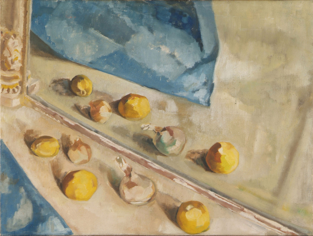 Throughout the still lifes, a mirror is often used to further complicate pictorial space.